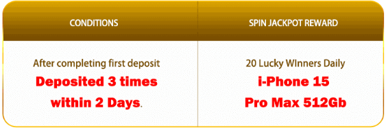 1. After completing the first 3 deposits within 2 day, just log in on the 3rd day to spin and have a chance chance to win i-Phone 15 Pro Max 512Gb